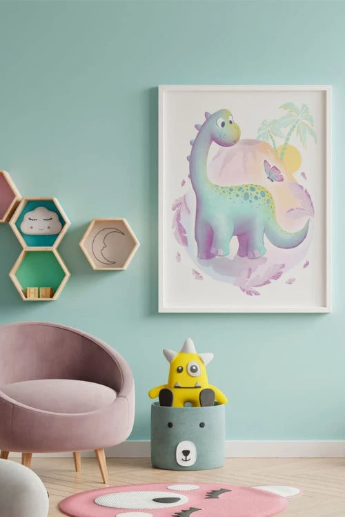 Crochetts Décoration Murale Enfant Impression De Dinosaure Fantasy Encadrée En Bois Blanc 43X33 Cm