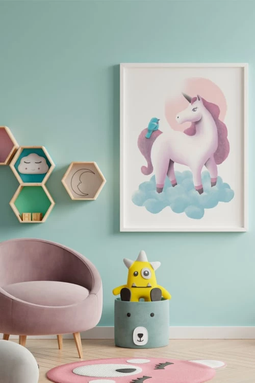 Crochetts Décoration Murale Enfant Impression De Licorne Fantasy Encadrée En Bois Blanc 43X33 Cm
