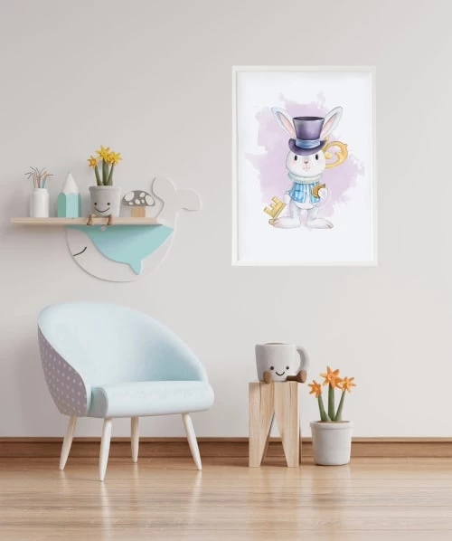 Crochetts Décoration Murale Enfant Impression Le Lapin Clé Encadrée En Bois Blanc 43X33 Cm