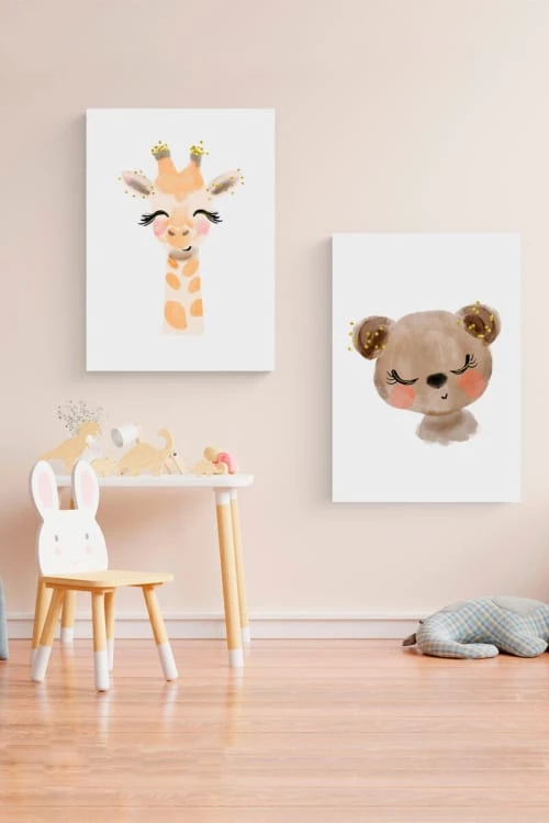 Crochetts Décoration Murale Enfant Pack Encadré Bois Blanc Impression Le Girafe Et L’ours 43X33 Cm