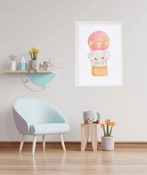 Crochetts Décoration Murale Enfant Pack Encadré Bois Blanc Impression Le éléphant Ballon 43X33 Cm