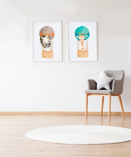 Crochetts Décoration Murale Enfant Pack Encadré Bois Blanc Impression Le Zèbre Ballon Et Girafe 43X33 Cm