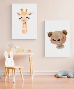 Crochetts Décoration Murale Enfant Pack Encadré Bois Blanc Impression Le Girafe Et L’ours 43X33 Cm